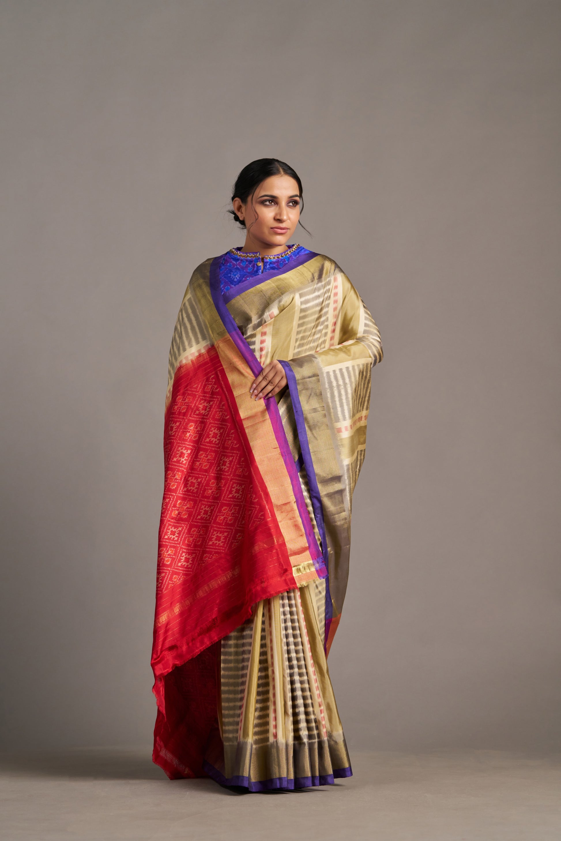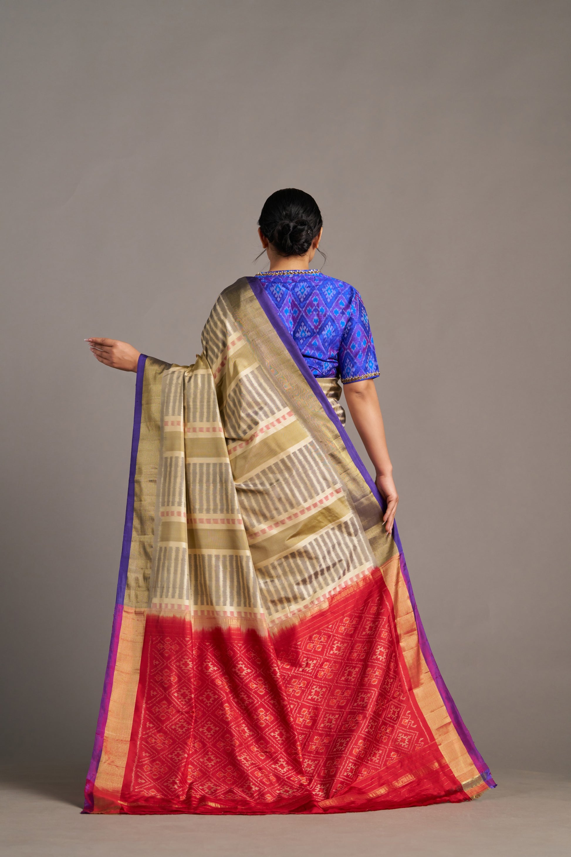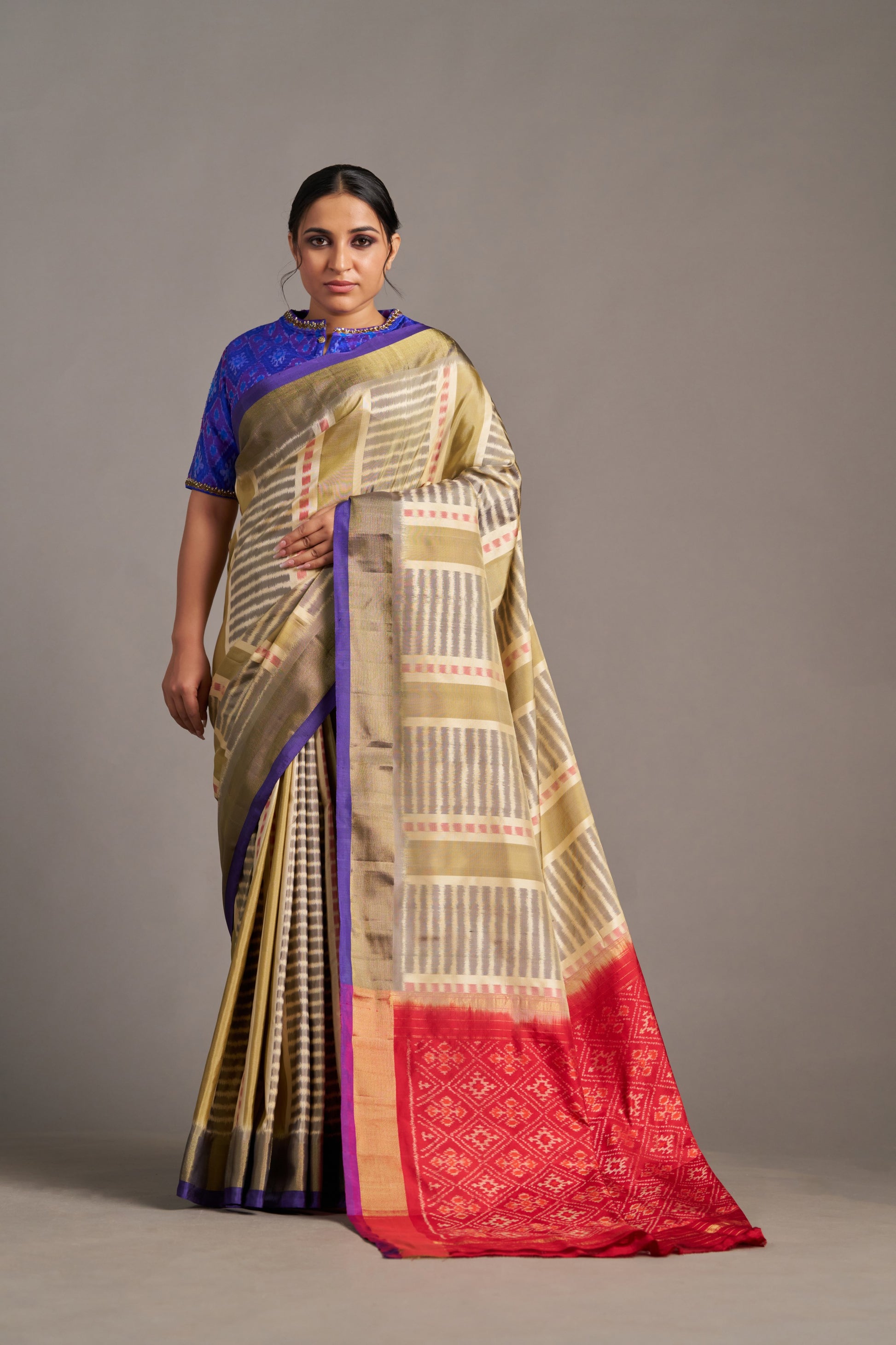 Discover understated elegance with our Contemporary Patola Saree, woven with intricate ikat patterns that blend traditional artistry with modern sophistication. The soft beige hue, paired with vibrant geometric designs, makes it an ideal choice for festive occasions and cultural celebrations. Embrace the timeless beauty of this Patola.