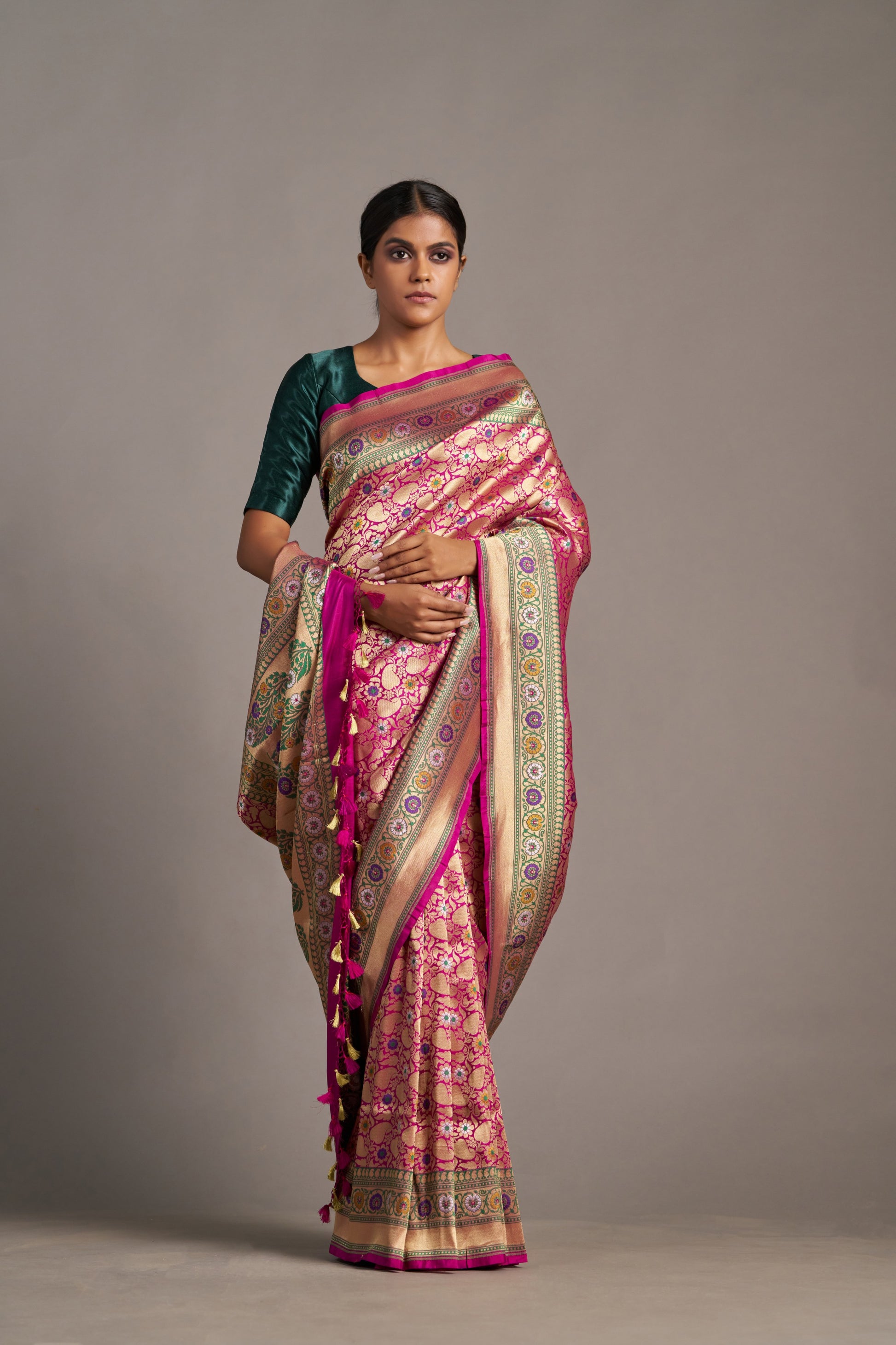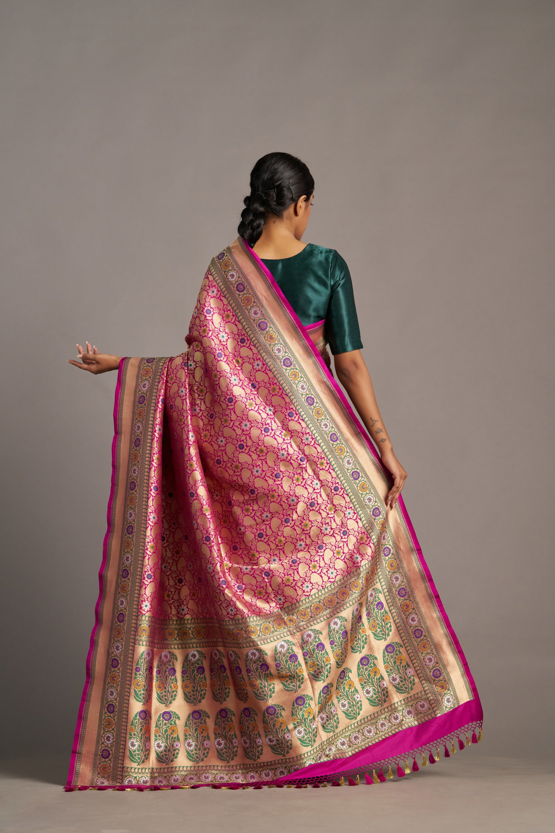Our sarees are handwoven and hand-dyed. Minor irregularities in weave or embroidery are part of the artisanal charm, not flaws.