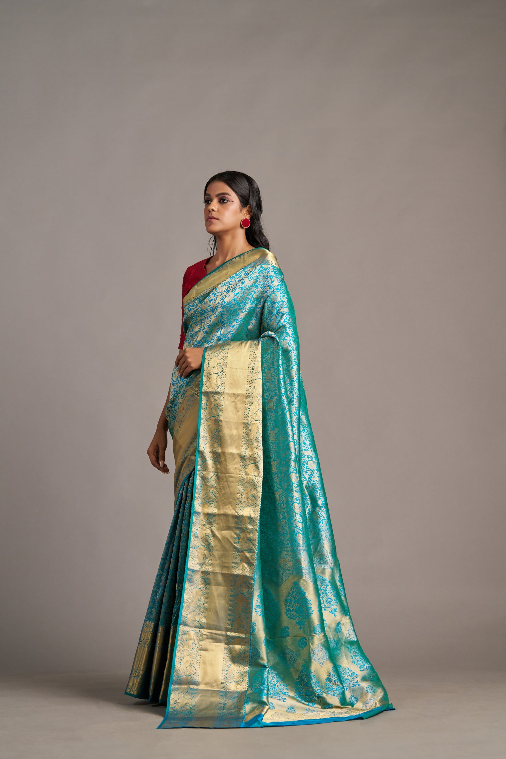 Indulge in luxury and tradition with our Turquoise Kanjivaram pure silk saree. The vibrant turquoise hue complements any skin tone, while the intricate Kanjivaram weave adds a touch of elegance. Made from pure silk, this saree offers unmatched comfort and quality. Elevate your wardrobe with this timeless and versatile piece!