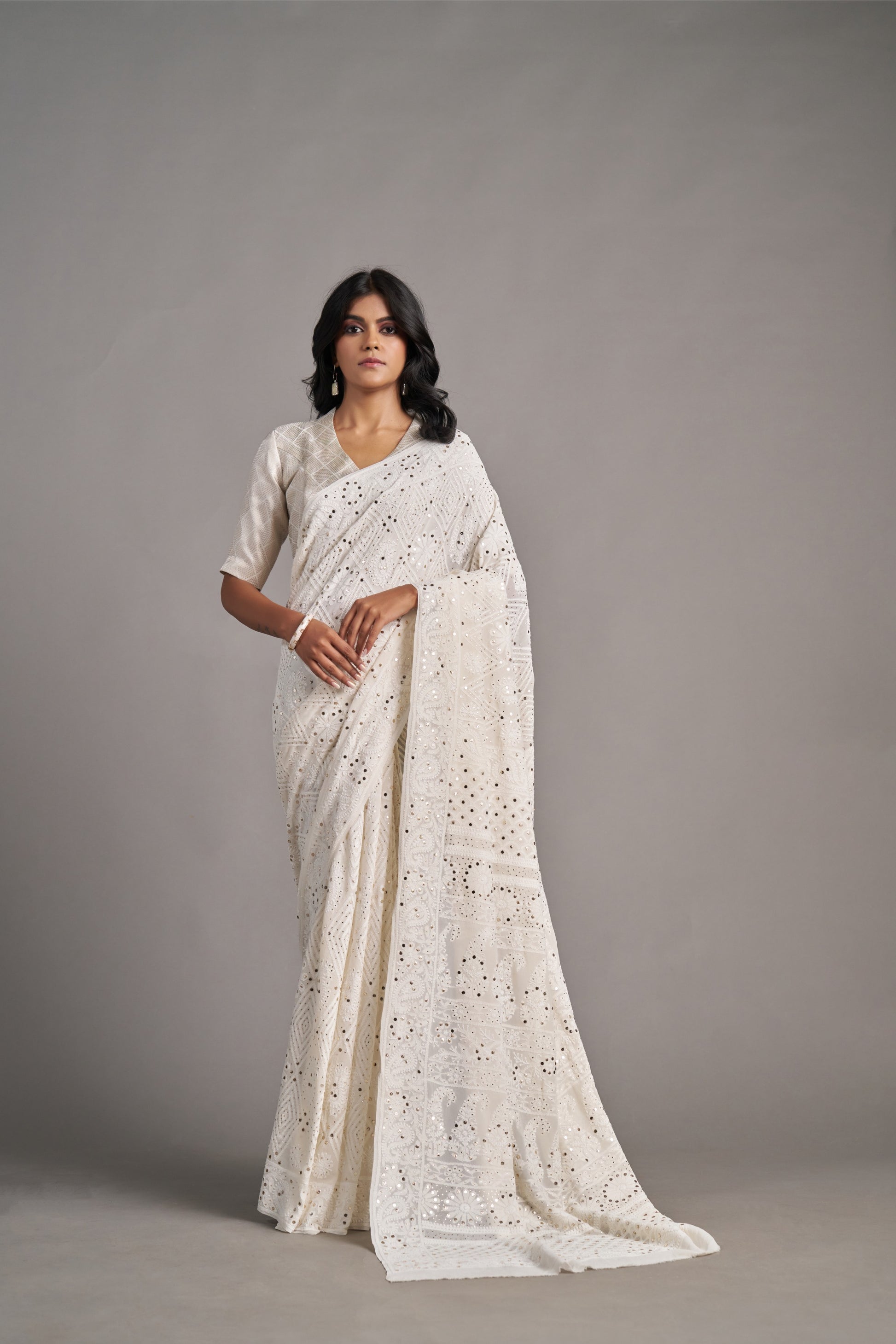 Unveil elegance with our White Lakhnavi Saree, featuring delicate chikankari embroidery that adds a refined touch to the pure white fabric. Handcrafted with intricate artistry, this saree is perfect for weddings, festivals, and special occasions, bringing a timeless charm to your wardrobe. Celebrate tradition with the grace of White Lakhnavi.